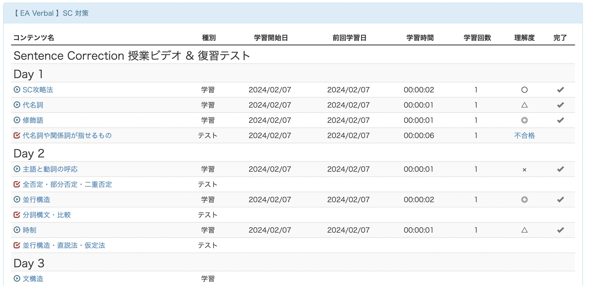 講師の側からも受講者1人1人の学習進捗や理解度を参照できますので、普段の学習法や試験戦略、本試験を受験すべきタイミング等に関して、的確な学習アドバイスをメールやWebサイト内で随時お知らせしていきます。