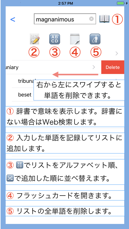 My Listでは、自由に単語を入力して辞書で調べたり、単語帳に記録・削除したり、フラッシュカードで学習したりすることができます。