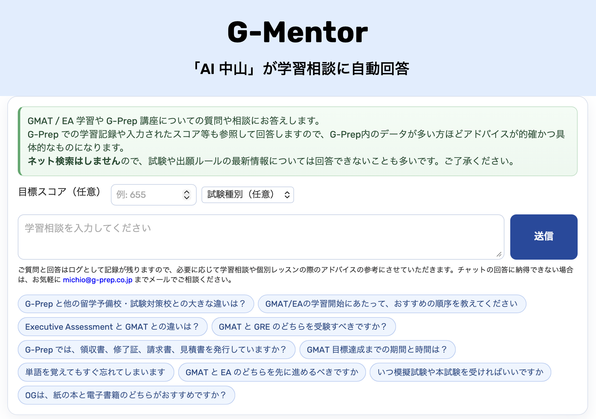 G-Prep 講座の学習記録・正解率・模試や本試験のスコア、中山のブログ情報やG-Prepサイト内の必要な情報を ChatGPT が参照して、受講生の学習状況に応じた個別具体的なアドバイスをする機能を搭載しています。
