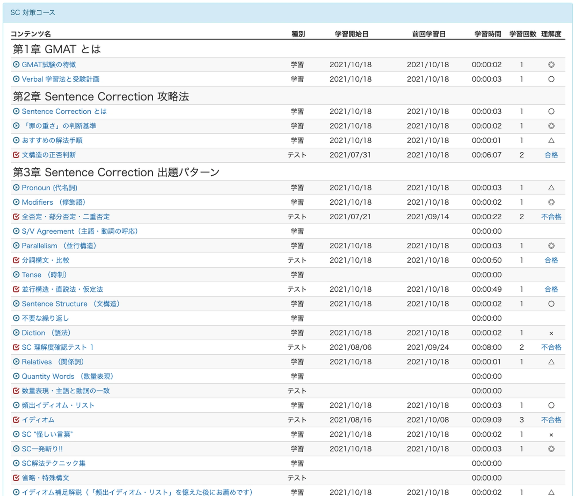 講師の側からも受講者1人1人の学習進捗や理解度を参照できますので、普段の学習法や試験戦略、本試験を受験すべきタイミング等に関してメールでご相談がありましたら、的確な学習アドバイス差し上げることができます。